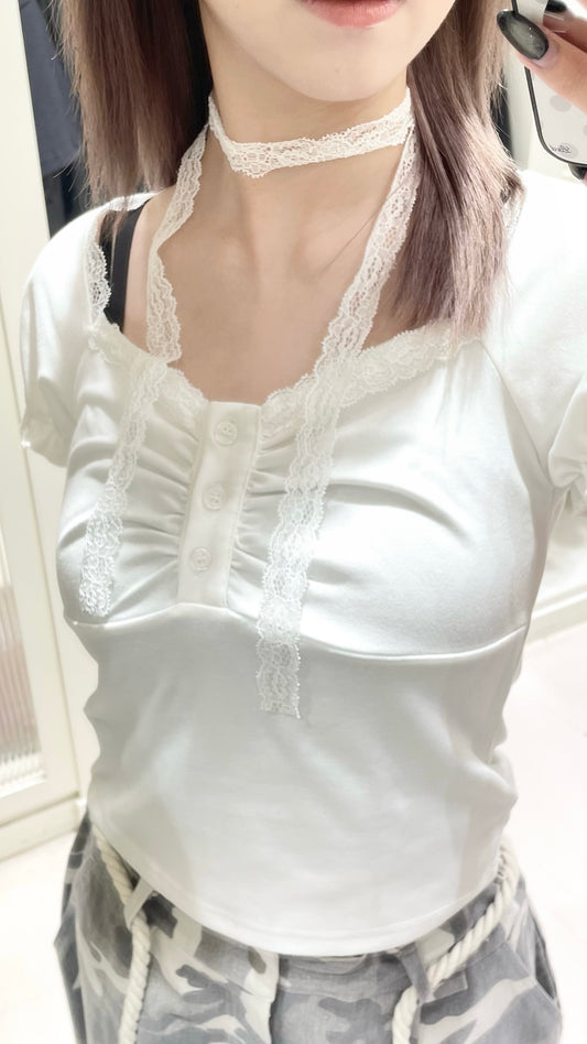 簡約v領花邊短袖套裝🍑